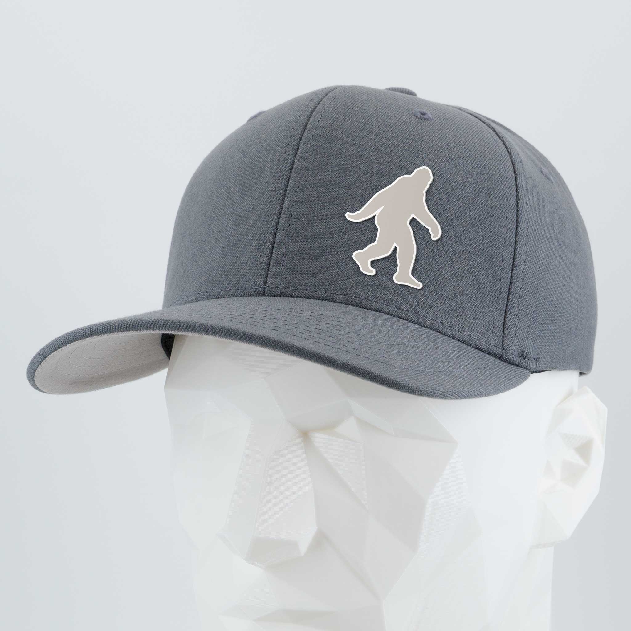 Showcased on a white geometric mannequin, the Eternal Glyph "Bigfoot Silhouette Albino" Flexfit® Premium Wool Blend Cap features a bold white Sasquatch glyph—ideal for Pacific Northwest folklore fans.